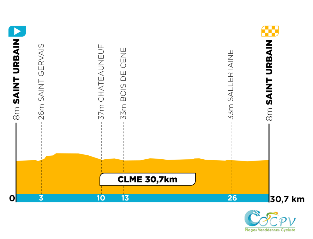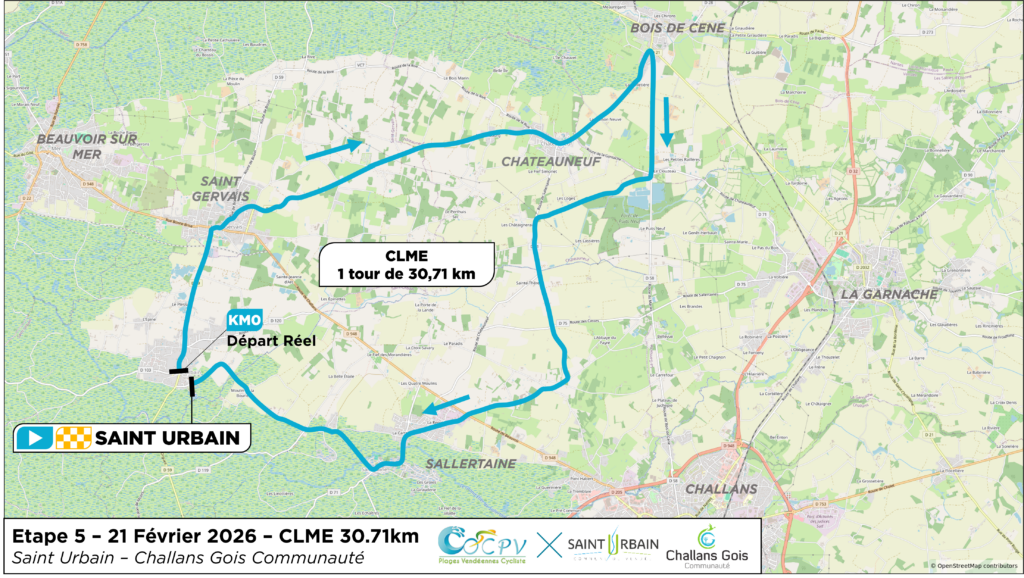 Collectif et millimétré – Une nouvelle étape du Circuit des Plages Vendéennes 2026 se disputera autour de Saint-Urbain sur un contre-la-montre par équipe de 30,71 km, tracé au cœur de la Communauté de communes Challans Gois. Depuis Saint-Urbain, le parcours traversera les bourgs de Saint-Gervais, Châteauneuf, Bois-de-Céné et Sallertaine, sur des routes exposées et rapides. Entre longues portions favorables aux gros rouleurs et passages plus techniques exigeant une parfaite coordination, les formations devront faire preuve d’unité et de maîtrise. Cet exercice chronométré, exigeant et sans approximation, promet un spectacle intense.