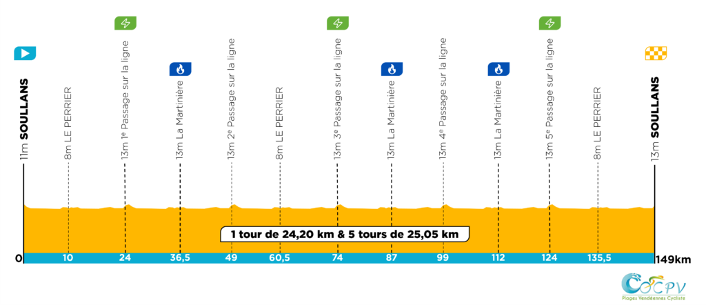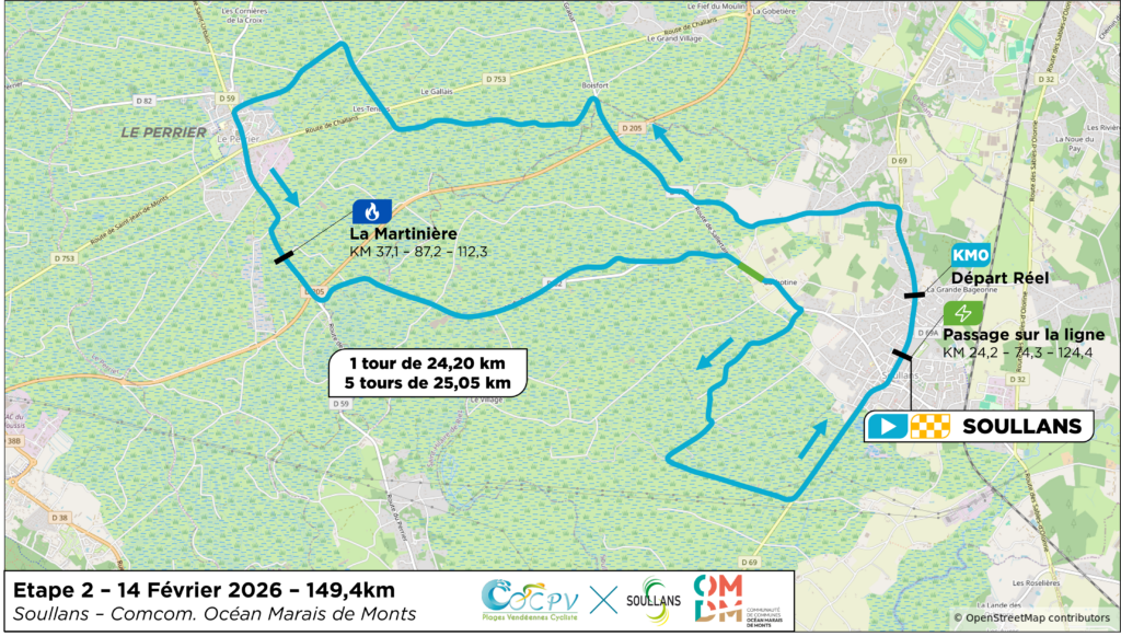 La bataille du vent – La seconde étape du Circuit des Plages Vendéennes 2026 se disputera autour de Soullans, au cœur du Marais Breton. Longue de 149,4 km, elle empruntera un circuit plat de 25,05 km, ne totalisant qu’environ 140 mètres de dénivelé. Un terrain idéal pour les rouleurs, mais où le vent pourrait transformer la course en véritable piège. Les bordures devraient animer la journée et provoquer une sélection implacable. L’an passé, dans la communauté de communes Océan Marais de Monts, Matthew Fox s’était imposé à La Barre-de-Monts, avant de remporter le classement final et de rejoindre à partir de cette année le peloton professionnel avec Lotto–Intermarché.