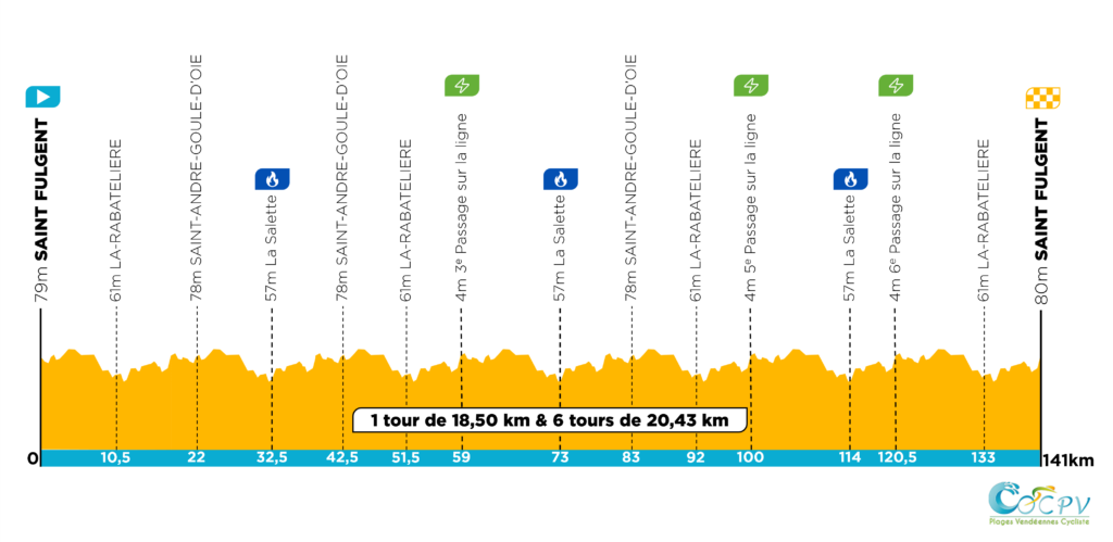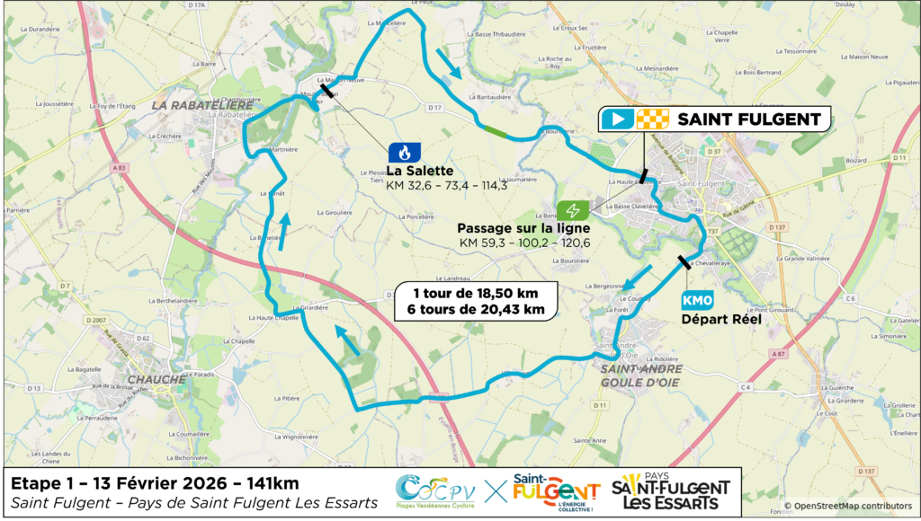 Exigeant et sélectif – La première épreuve du Circuit des Plages Vendéennes 2026 s’élancera de Saint-Fulgent pour une boucle de 141 km à travers les bourgs de Saint-André-Goule-d’Oie et de La Rabatelière. Sur un circuit vallonné et piégeux, les organismes seront rapidement mis à l’épreuve. Les difficultés successives, dont la célèbre montée de la Salette, promettent une course animée et sans répit. Cette manche inaugurale lancera officiellement la saison cycliste sur route dans l’Ouest de la France, sacrant d’entrée un coureur complet et solide.